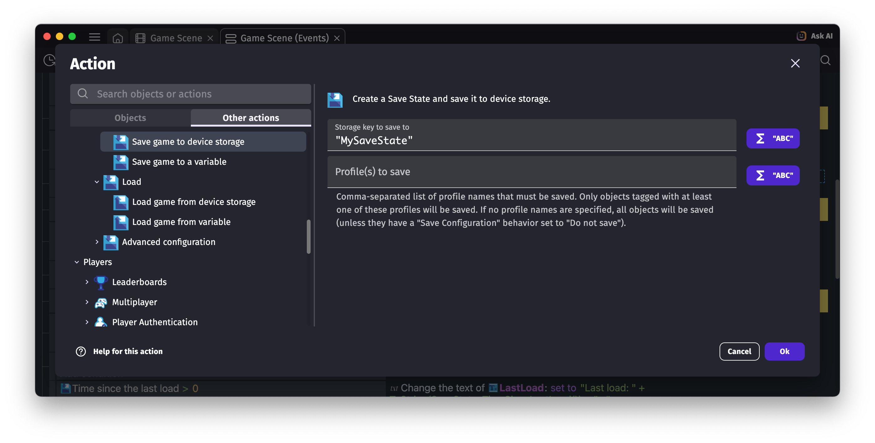 Saving to and loading from device storage is asynchronous. The operation completes at the end of the frame — use the "Save just succeeded/failed" and "Load just succeeded/failed" conditions (see below) to react to the result rather than acting immediately after the action.