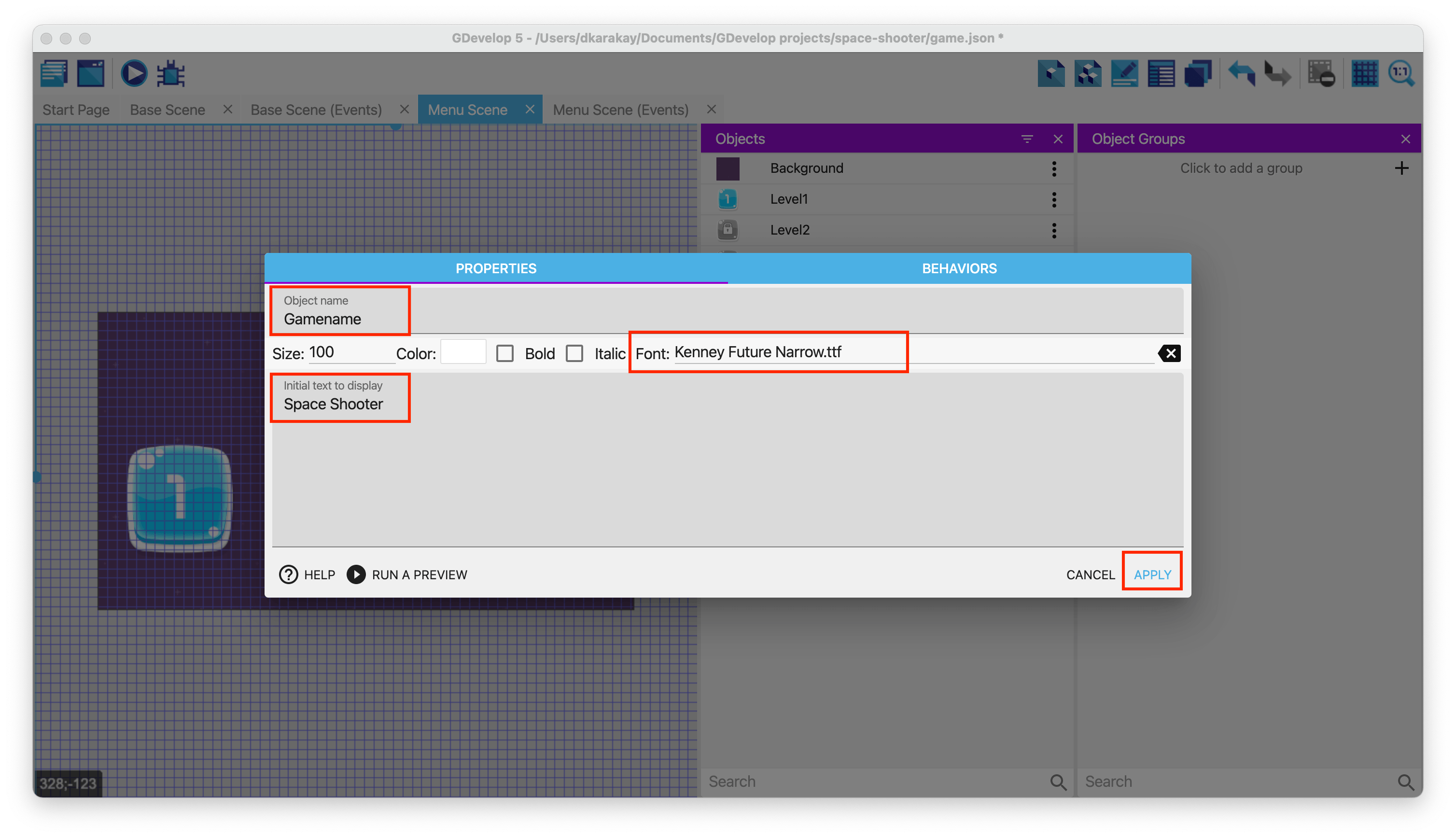 Then, create a new object called Gamename to show the game's name in the scene view. Fill the text with "Space Shooter", set the font Kenney Future Narrow, and change the size 100.