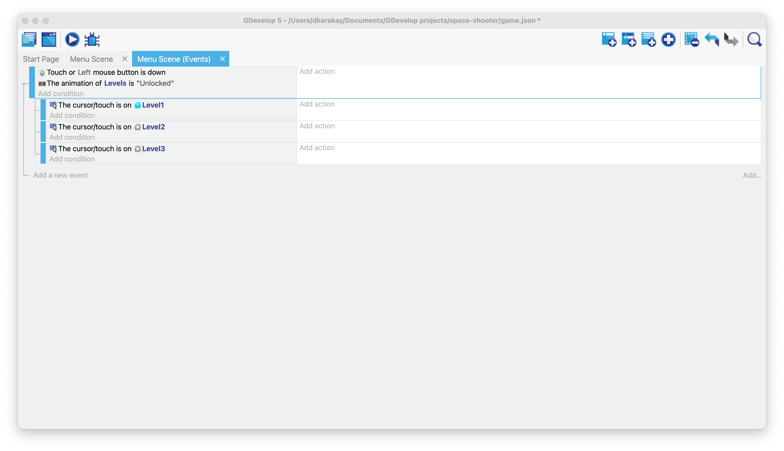 Open the events tab, and add a new event to check if the left button of the mouse has been pressed or not. We will use this to select level buttons.